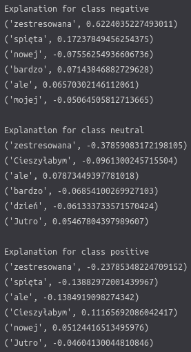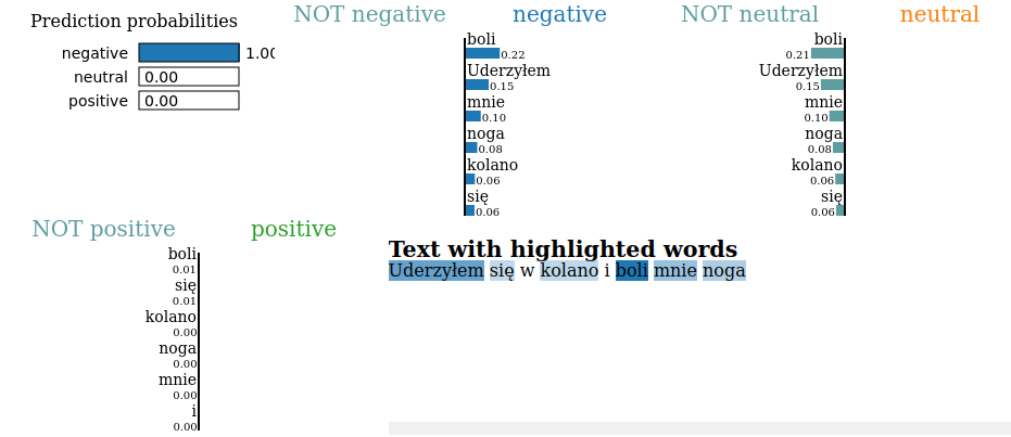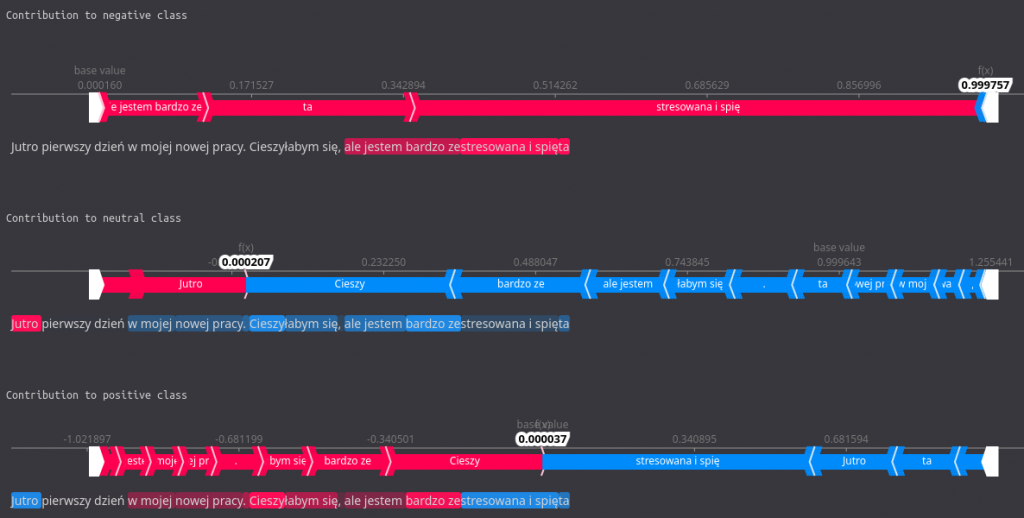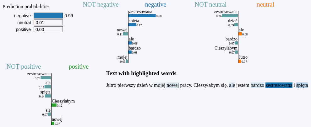 In the dedicated LIME visualisation above, it is a bit easier to interpret the results. We can quickly tell which tokens were the most influential for which class. For example, the word ‘zestresowana’ significantly impacted all categories, greatly increasing the chance for negative and reduces bothneutral and positive ones.
