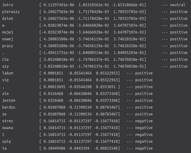 For instance, we observe that the words (or their parts) ’zestresowana i spięta’ influence the negative sentiment quite a bit while lowering the positive one significantly.