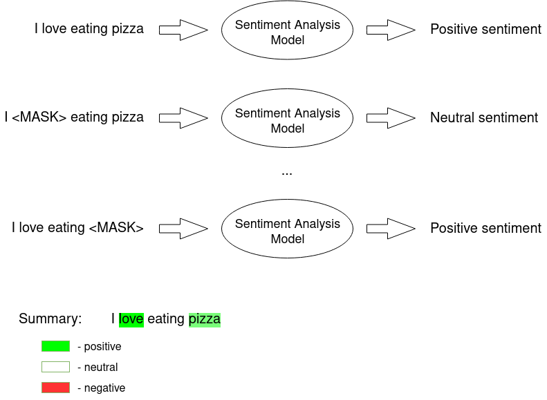 We perform a perturbation of the input sequence (e.g. we hide one sentence word (marked with MASK token)) and check how the predictions differ. Then the perturbed outputs are weighted by their similarity to the explained example.